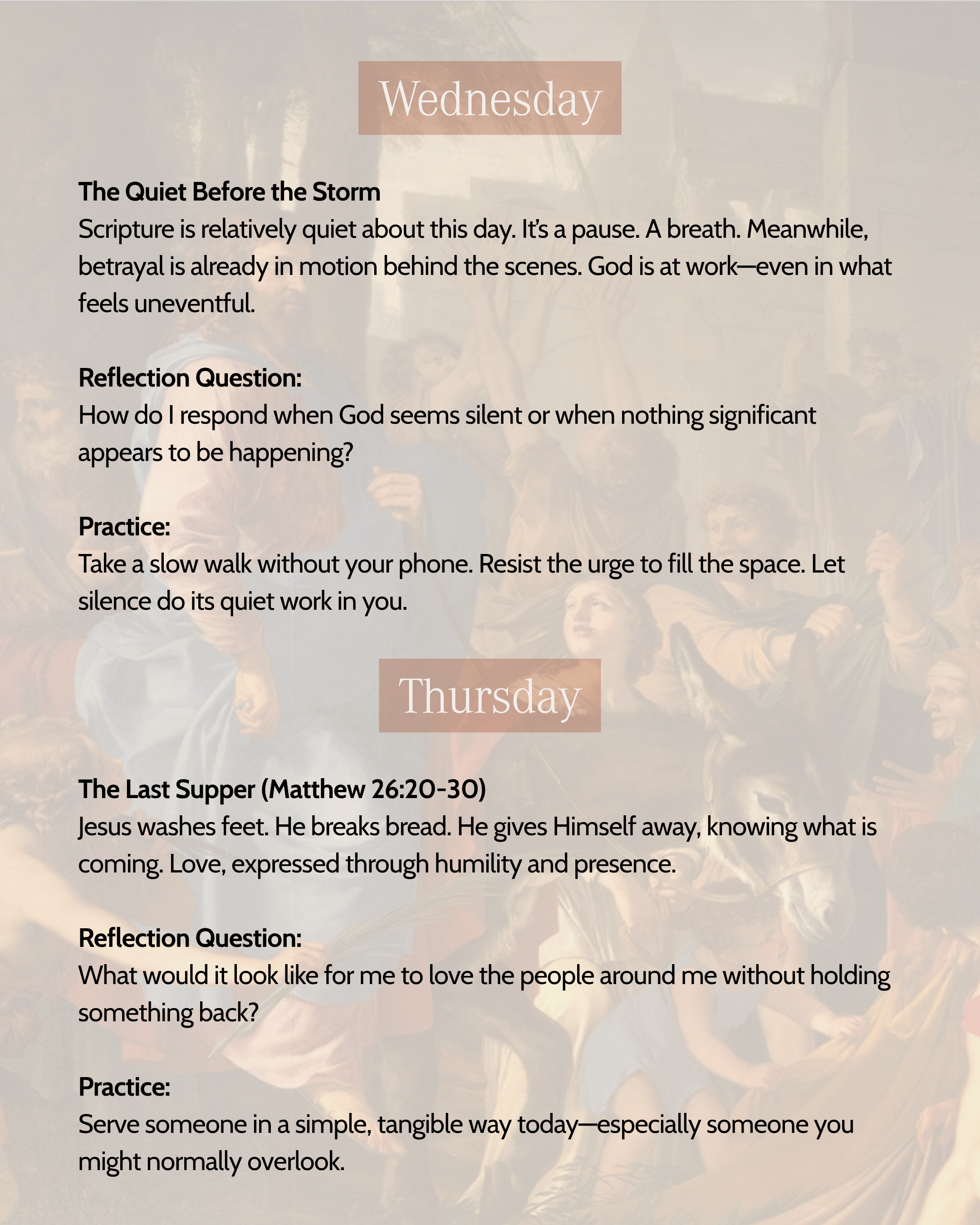 Scripture is relatively quiet about this day. It’s a pause. A breath. Meanwhile, betrayal is already in motion behind the scenes. God is at work—even in what feels uneventful.