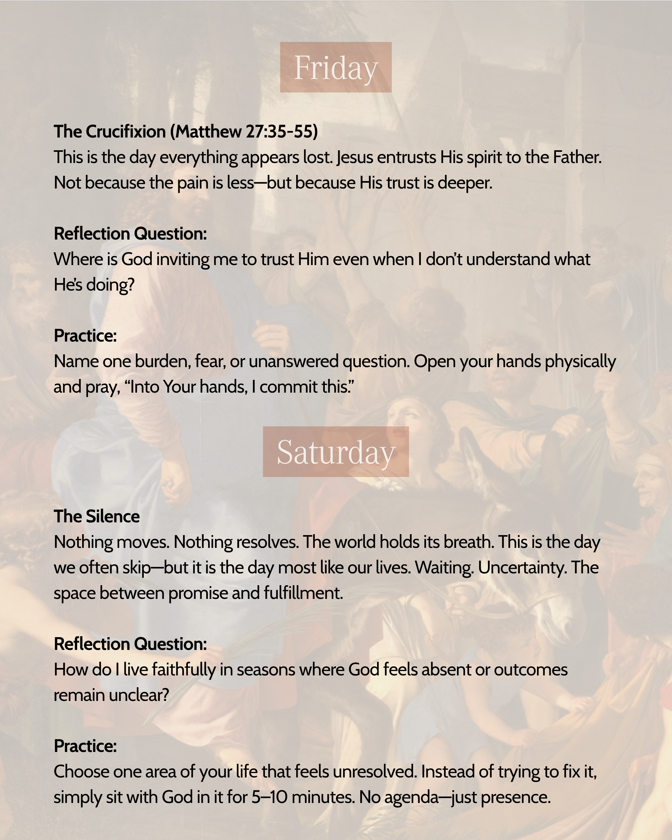 From Monday through Saturday, Jesus walks a road that confronts false peace, exposes shallow faith, and ultimately entrusts everything to the Father. If we are willing, we can walk that road with Him—not as spectators, but as participants.